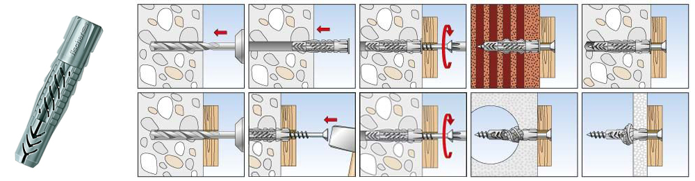 Они устанавливаются в плотные структуры, такие как бетон или полнотелый кирпич. Анкеровка осуществляется благодаря трению втулки об отверстие в несущей стене. Из преимуществ такого элемента можно отметить скорость и доступность установки, а недостатком является то, что его невозможно использовать повторно.