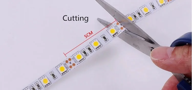 Теперь Вы поняли, что светодиодную ленту можно разрезать на множество отрезков, но шаг резки должен быть равен длине одного сегмента. Резать разрешено посередине контактных площадок, обычно место разрешенного реза обозначено линией, иногда наносится пиктограмма в виде ножниц.